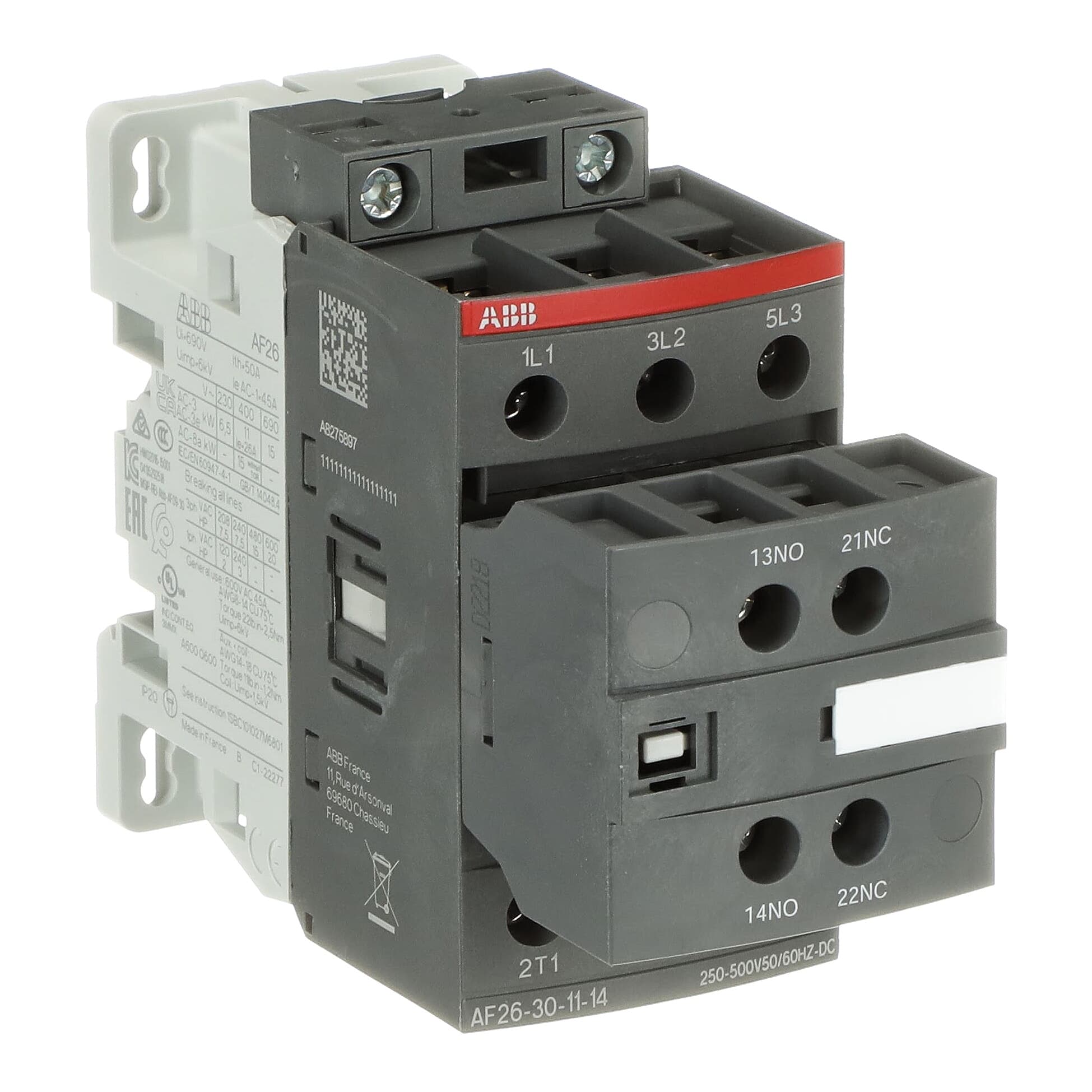 Long Description: The AF26-30-11-14 is a 3 pole – 690 V IEC or 600 UL contactor with pre-mounted auxiliary contacts and screw terminals, controlling motors up to 11 kW / 400 V AC (AC-3) or 15 hp / 480 V UL and switching power circuits up to 45 A (AC-1) or 45 A UL general use. Thanks to the AF technology, the contacto…Show morer has a wide control voltage range (250-500 V 50/60 Hz and DC), managing large control voltage variations, reducing panel energy consumptions and ensuring distinct operations in unstable networks. Furthermore, surge protection is built-in, offering a compact solution. AF contactors have a block type design, can be easily extended with add-on auxiliary contact blocks and an additional wide range of accessories.Show less