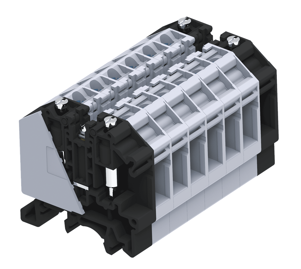 This is a 6 pole Current Transformer shorting Terminal block assembly. All Meter and CT connections can be safely terminated with the help of captive nuts in the terminals. A central shorting current bar is pre-installed and CT shorting screws can be connected in the respective points to short the secondary of CTs for measurement and calibration of meters. The entire assembly is IP20 shock resistant and standard K series marking tags can be installed for clear circuit identification.